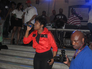 Now the Rosci lateness. We found out that Rosci landed in the STL around 10ish and headed to her hotel. We dont know what transpired on what caused her lateness or if there was a set time for her to appear, but when Sir Thurl and Tim Slater got the hype mic going, we speculated that this was the time that probably Rosci's role as host was to be. Many people kept asking OUTTOWN, "Where is Rosci?" Well, when she did show, which was a little after 1 a.m., she was surrounded by bodyguards (which we questioned as far as her celeb status) and whisked upstairs to the dee-jay area and immediately started hypin on the mic with one liners (e.g. "Where my Ballas at?" ), but unfortunately, those clubbers focused more on exiting from the building and heading to their next destinations.